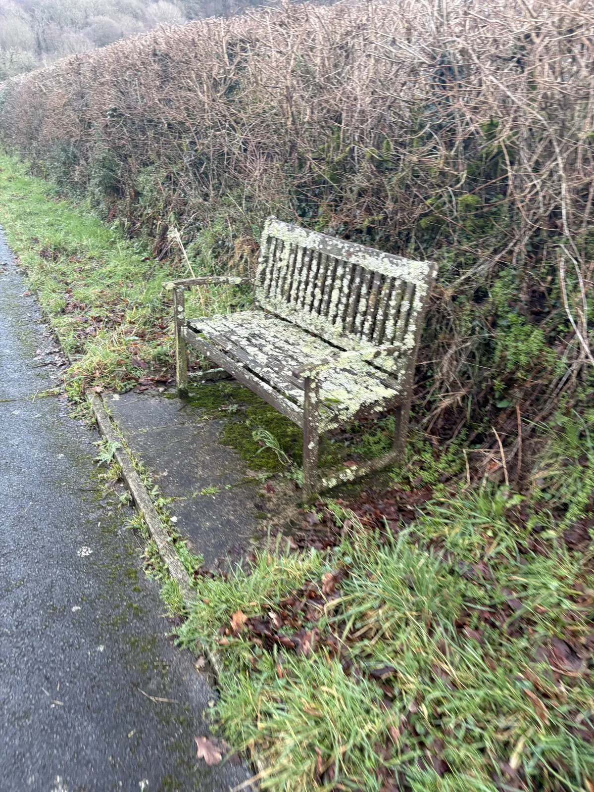 An unloved bench that we saw on a walk. It is completely covered in moss.
