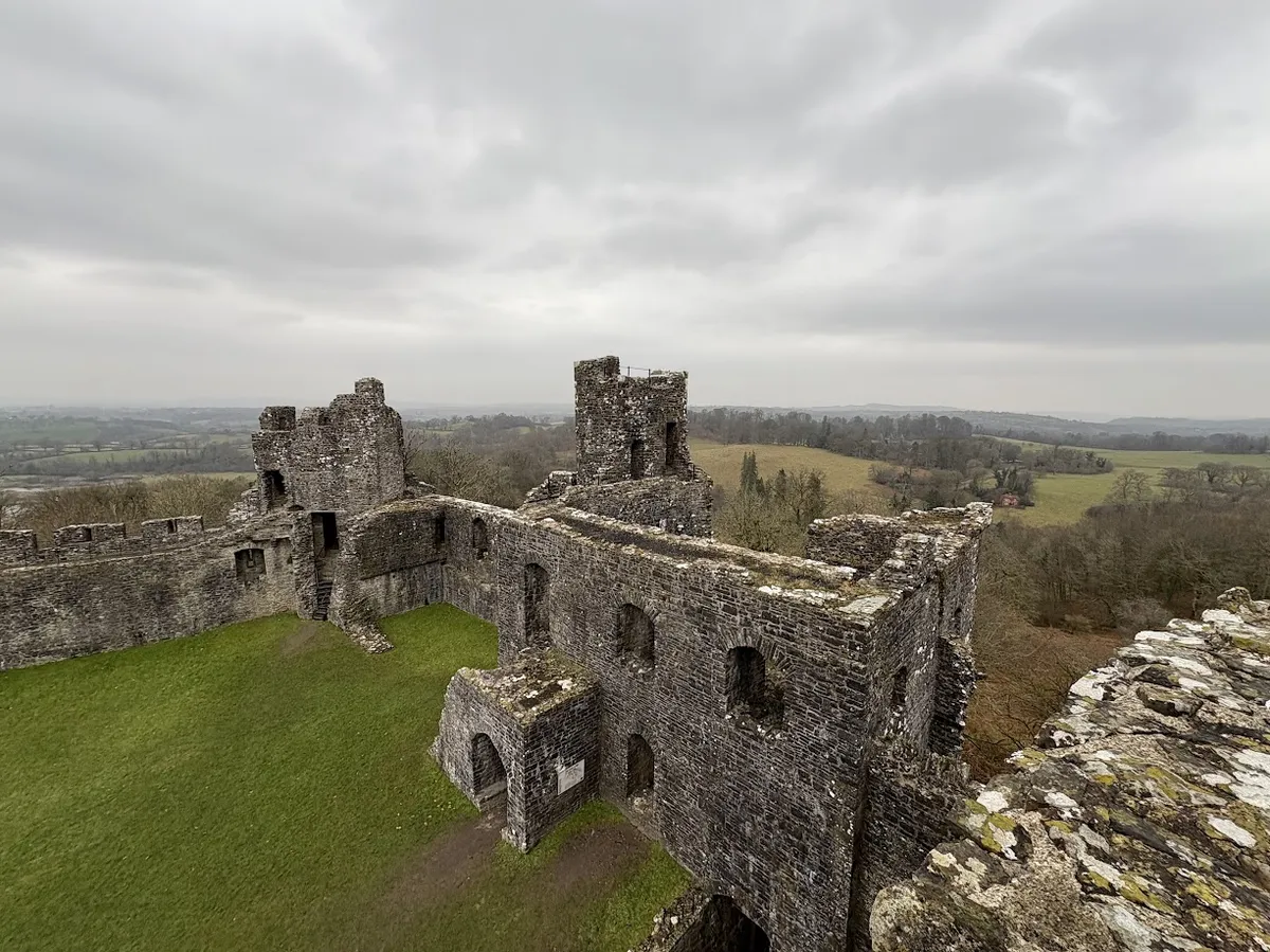 Ruins of Dinefwr Castle with stone walls and towers overlooking a green landscape under a cloudy sky.