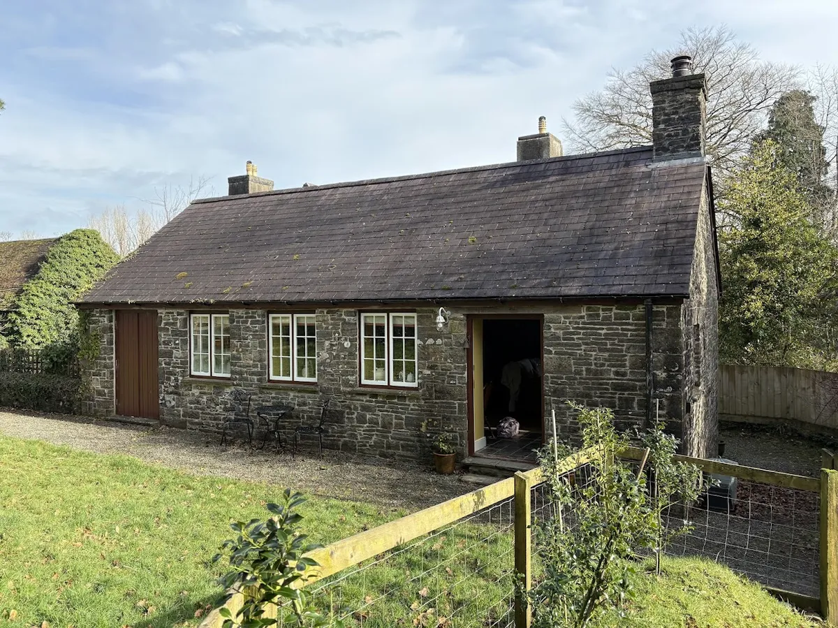 Stone-built cottage with a slate roof, white-trimmed windows, and an open door, set in a grassy garden with a small wooden fence.
