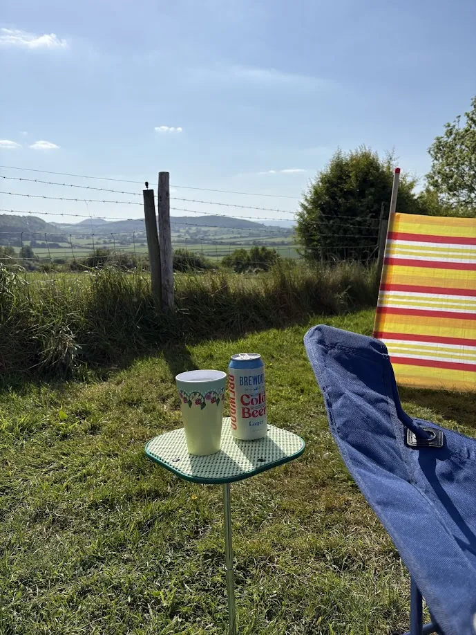 Cheers! a grassy area and a barbed wire fence overlooking rolling hills and trees. In the foreground, there's a small green table holding a floral-patterned cup and a can of Brewdog Cold Beer Lager. -