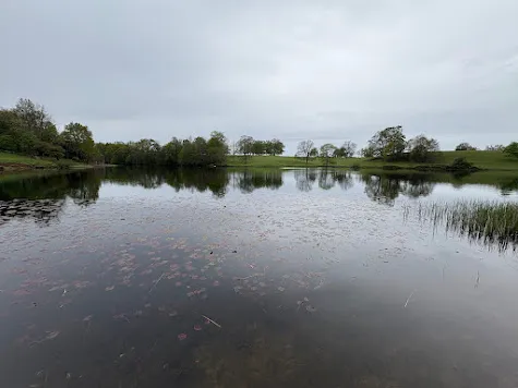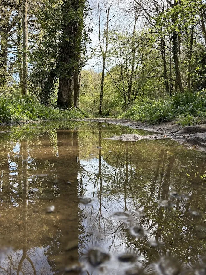Outdoor forest scene featuring a small pond with pebbles leading across the water. A wooden post with a small sign stands near the pathway. The sky is cloudy, casting soft, diffused light over the landscape. -