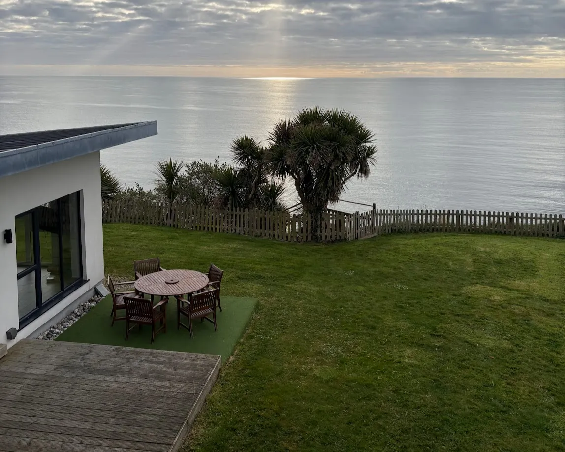 Modern coastal retreat with ocean view. White building with large windows, wooden deck, artificial grass area with round wooden table and four chairs. Lawn leads to wooden fence with palm trees beyond. Calm ocean, partly cloudy sky with sunlight on water. -