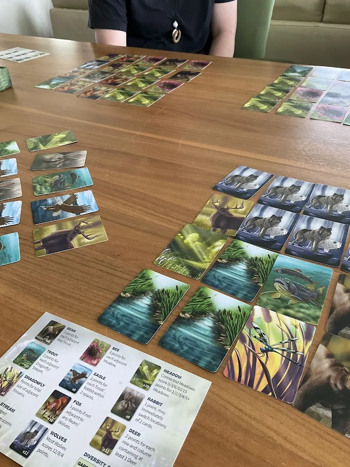 Tabletop card game focused on nature and wildlife. Various cards depict animals like wolves, deer, trout, and birds, along with landscapes such as meadows and streams.