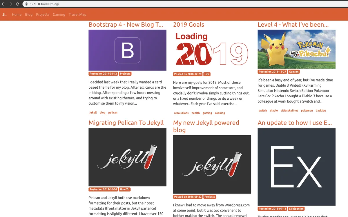 After spending a few hours messing around with existing themes, and trying to customise them to my vision for what I wanted... someone at my local hackspace suggested I took a look at Bootstrap when I couldn't get them to generate valid HTML properly. This was cool because I got to learn something new (see 2019 goals!) but because Bootstrap is modern and responsive and made creating the cards I longed for super duper simple.