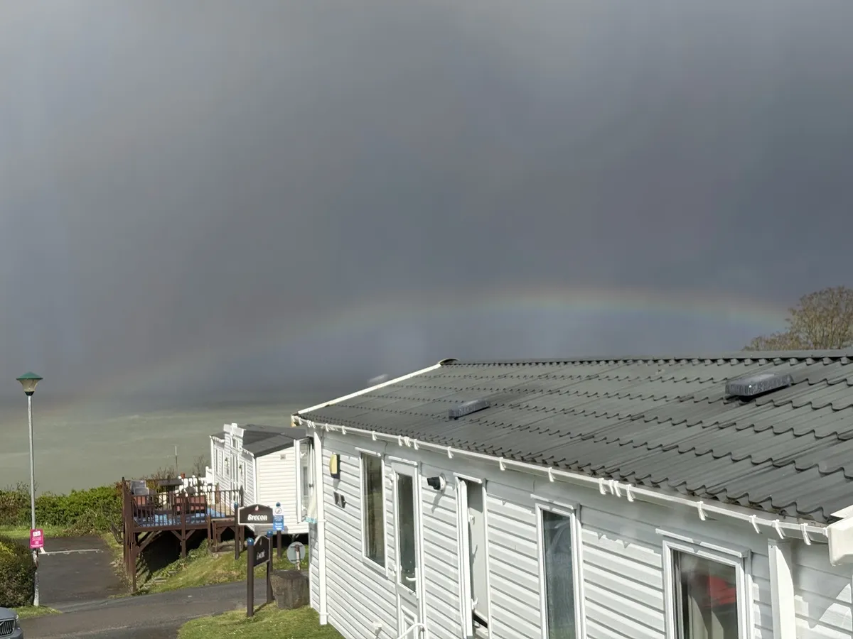 View from the caravan with a rainbow visible over Cardigan Bay -